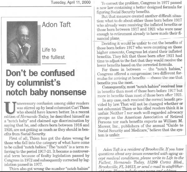 Surely there are some residents of Hernando County who are Notch Babies, and would like to see this matter brought to the fore. I wonder whether anyone beside me is concerned? If nothing is done, the Notch Babies will go down in the history books as a cause buried in political maneuvering.